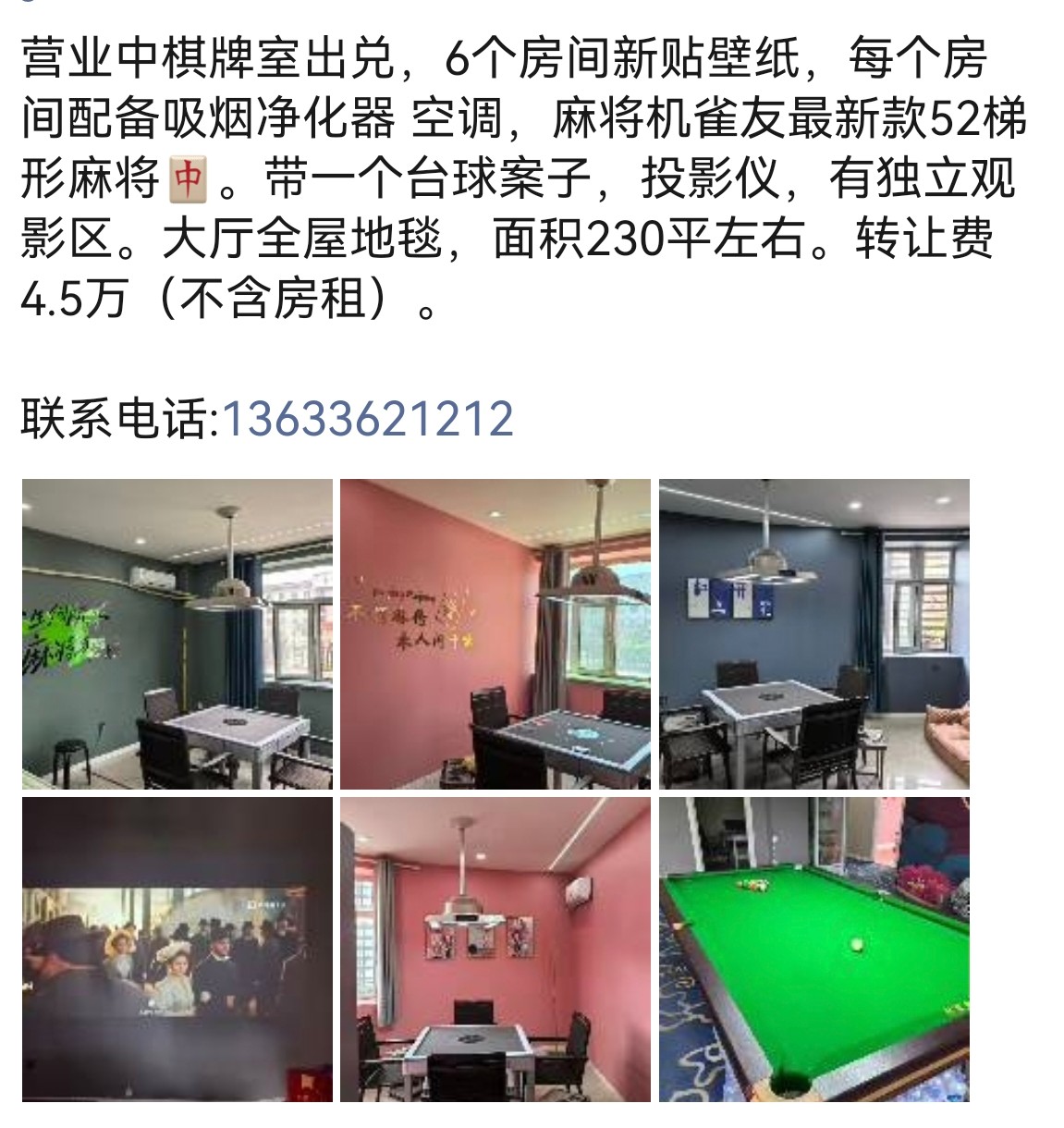营业中棋牌室出兑,6个房间,一个台球案子,有投影仪。休息大厅,全屋地毯。价格优惠。