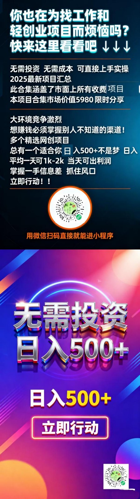 还在为找工作、创业而烦恼?2025最新项目合集,含市面所有项目,价值5980元,免费分享 无需投资 实现0成本创业保姆级教程零基础上手,日入500+,扫码进小程序!