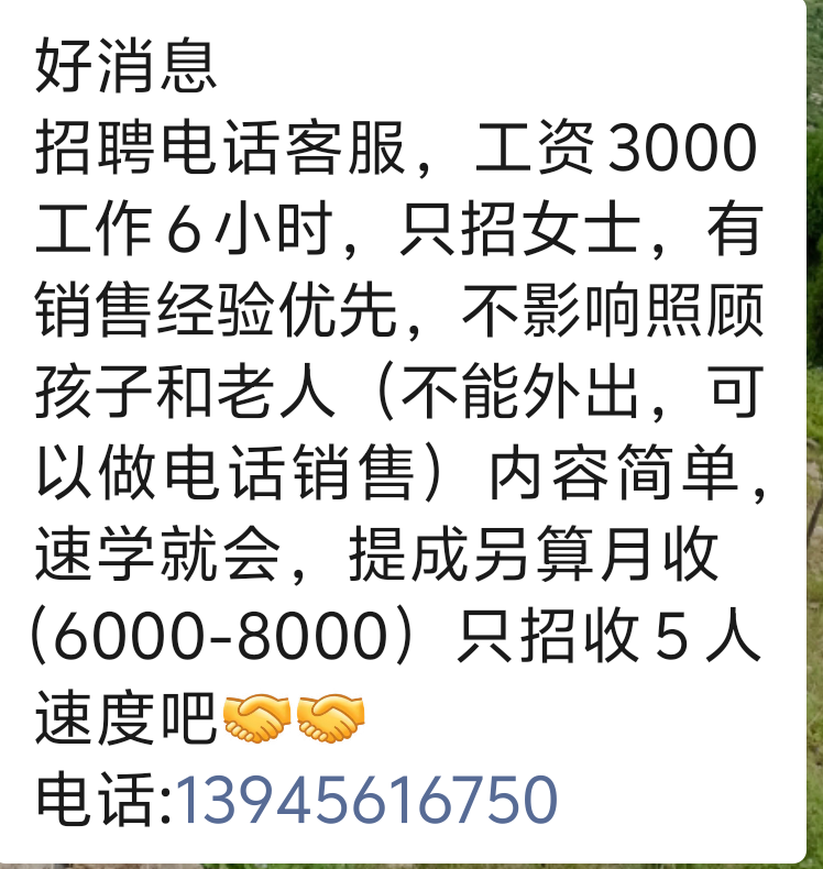招聘电话客服,工资3000工作6小时,只招女士,有销售经验优先,不影响照顾孩子和老人(不能外出,可以做电话销售)内容简单,速学就会,提成另算月收6--8千