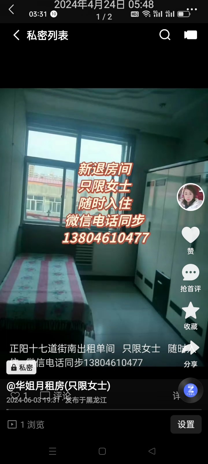 正阳十七道街银行楼出租单间 只限女士 随时入住 微信电话同步13804610477