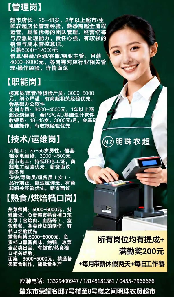 明珠农超诚聘以下岗位: