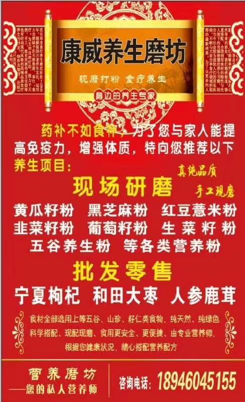 专业从事养生打粉十余年,售卖黄瓜籽粉,黑芝麻粉,五黑粉,祛湿粉等各类营养粉,市内免费送货,全国包邮,地址正阳六道街南,路西第一家,康威山货干果