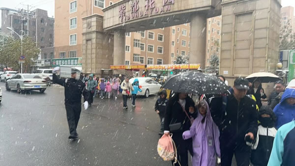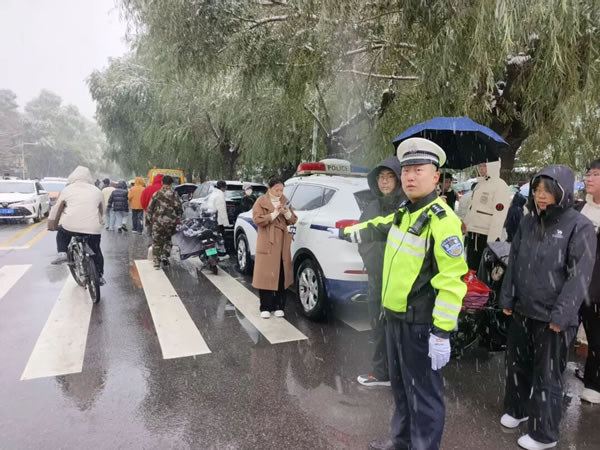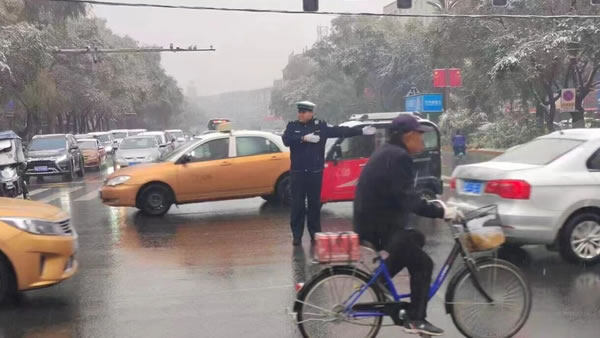 正值上学上班早高峰时段,雪势愈发急切。路上的车流量正逐渐增大,一排排车辆披着白皑皑的雪花,司机们开启行车灯,打开雨刮,小心翼翼地驾驶着车辆。此时,从主干道到居民区的街巷,身着制服的交警身影早已铺开,在风雪中织就了一张守护之网。在城区主要交通枢纽、小区门口、学校周边,忙碌的交警随处可见。雪花落在帽檐上化成水珠,顺着脸颊往下淌,他们却无暇顾及擦拭。他们的指挥手势始终沉稳而有力,每一次抬臂、转向,都仿佛在风雪中划出了安全的坐标,给过往司机“吃下安全的定心丸”。
