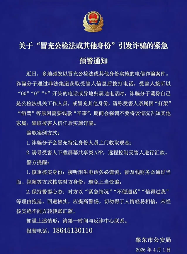 肇东市公安局:关于“冒充公检法或其他身份”引发诈骗的紧急预警通知!